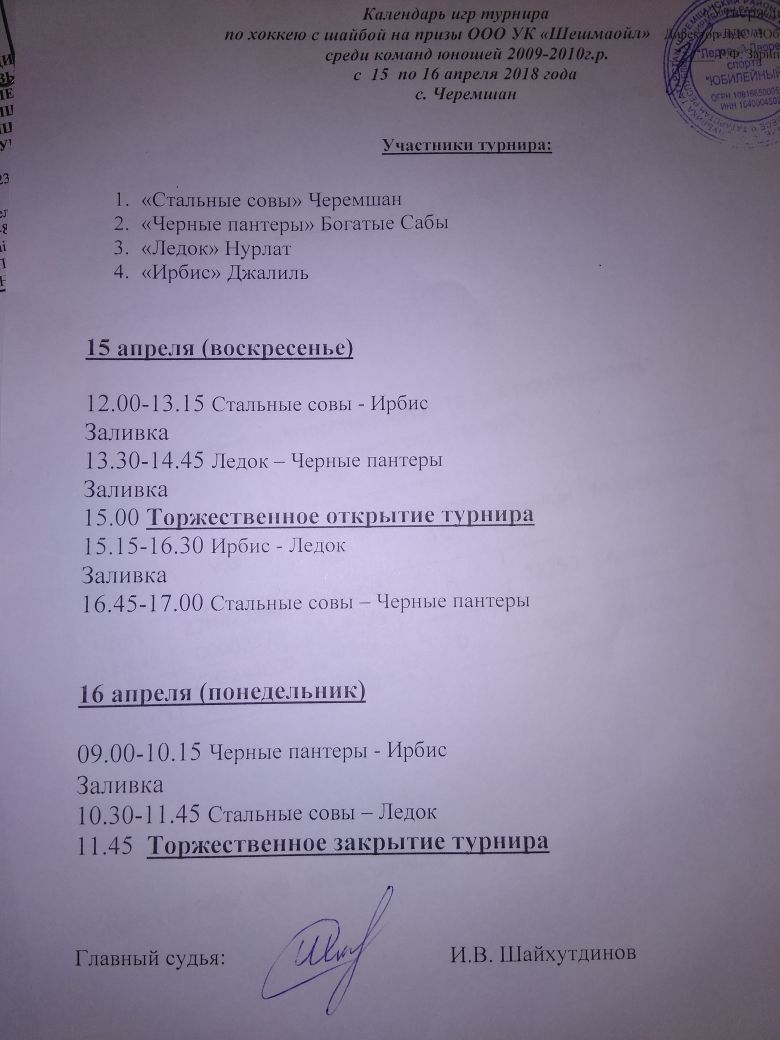 15-16 апреля в МБУ "Ледовый Дворец спорта "Юбилейный" состоится турнир по хоккею с шайбой на призы управляющей компании "Шешмаойл" среди команд юношей 2009-2010г.р.