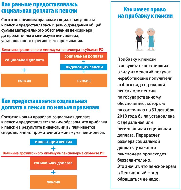 1 апреля 2019 года принят Федеральный закон «О внесении изменений в статью 12.1 Федерального закона «О государственной социальной помощи» и статью 4 Федерального закона «О прожиточном минимуме в Российской Федерации», в соответствии с которыми с 1 января 2019 года меняются правила предоставления неработающим пенсионерам социальной доплаты к пенсии до прожиточного минимума пенсионера.