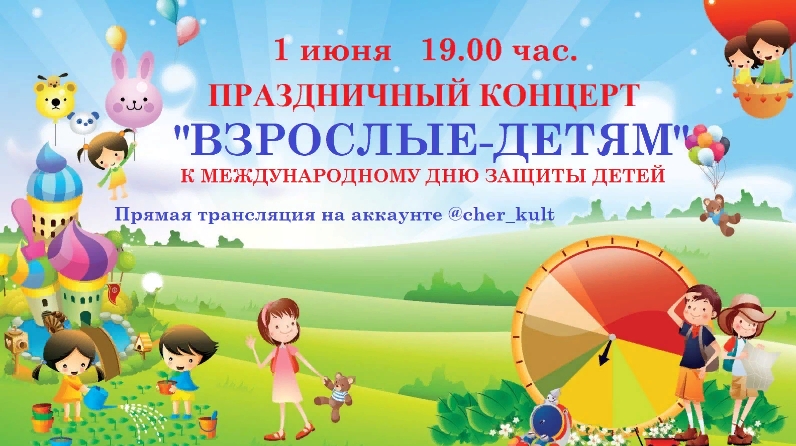 Сегодня, 1 июня в 19.00 часов состоится праздничный онлайн-концерт «Взрослые – детям!». Приглашаем всех детишек на концерт, который пройдет в прямом эфире на аккаунте @cher_kult.