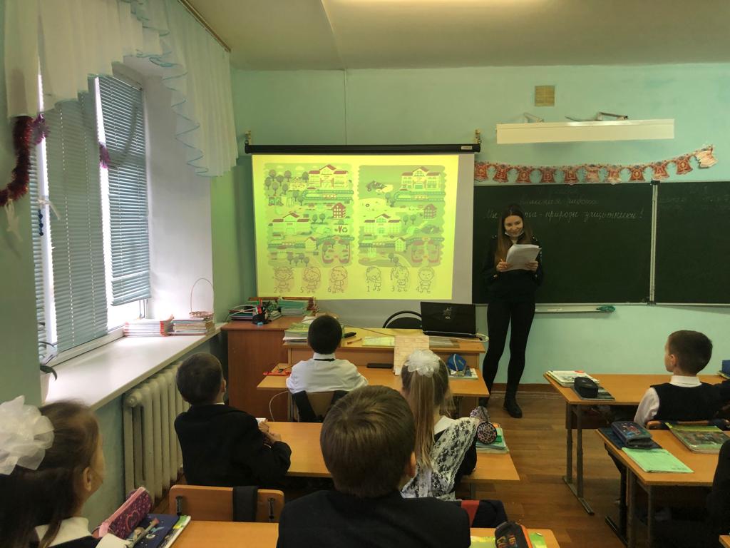 Салихова Лейсан Айратовна-специалист 1 разряда Юго - Восточного территориального управления Министерства экологии и природных ресурсов Республики Татарстан подготовила "Открытый урок" для детишек, где ребята играли, отгадывали, рисовали, отвечали на вопросы и высказывали свою точку зрения!!! А ребята вместе с учителем Гафиевой Э.М. дружно поблагодарили гостей за урок и за подарки!!!