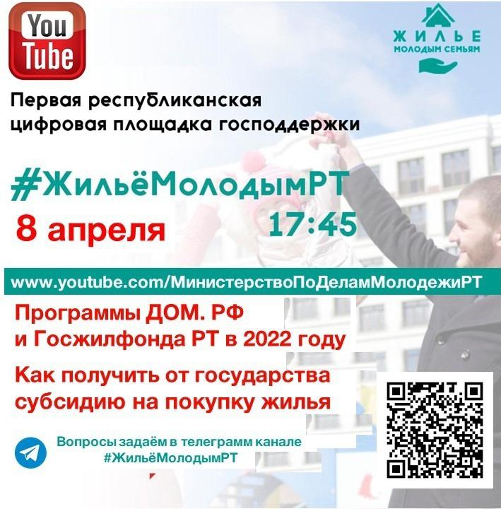 Чтобы подключиться к трансляции прямого эфира #ЖильёМолодымРТ нужно в пятницу, 8 апреля зайти в 17.45 на YouTube канал Минмолодежи РТ, или по ссылке