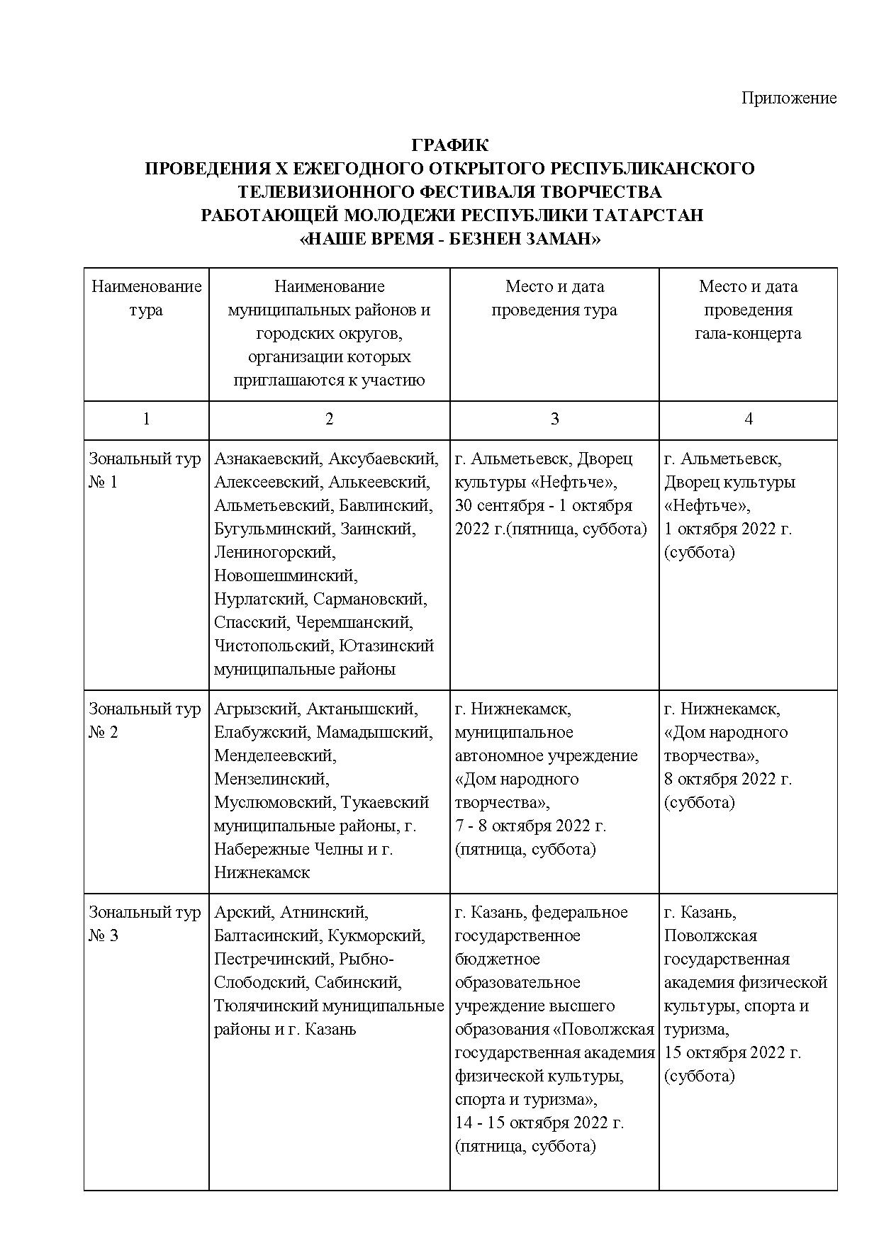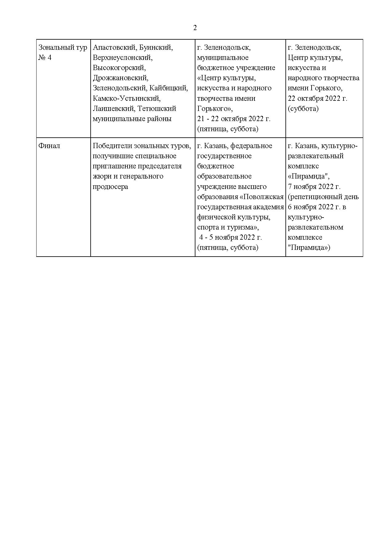 Отборочные этапы фестиваля пройдут с сентября по октябрь т.г.и будут включать в себя четыре зональных отборочных этапа в городах Альметьевск, Нижнекамск, Казань и Зеленодольск, суперфинал и гала-концерт – в г. Казани в ноябре 2022 года.