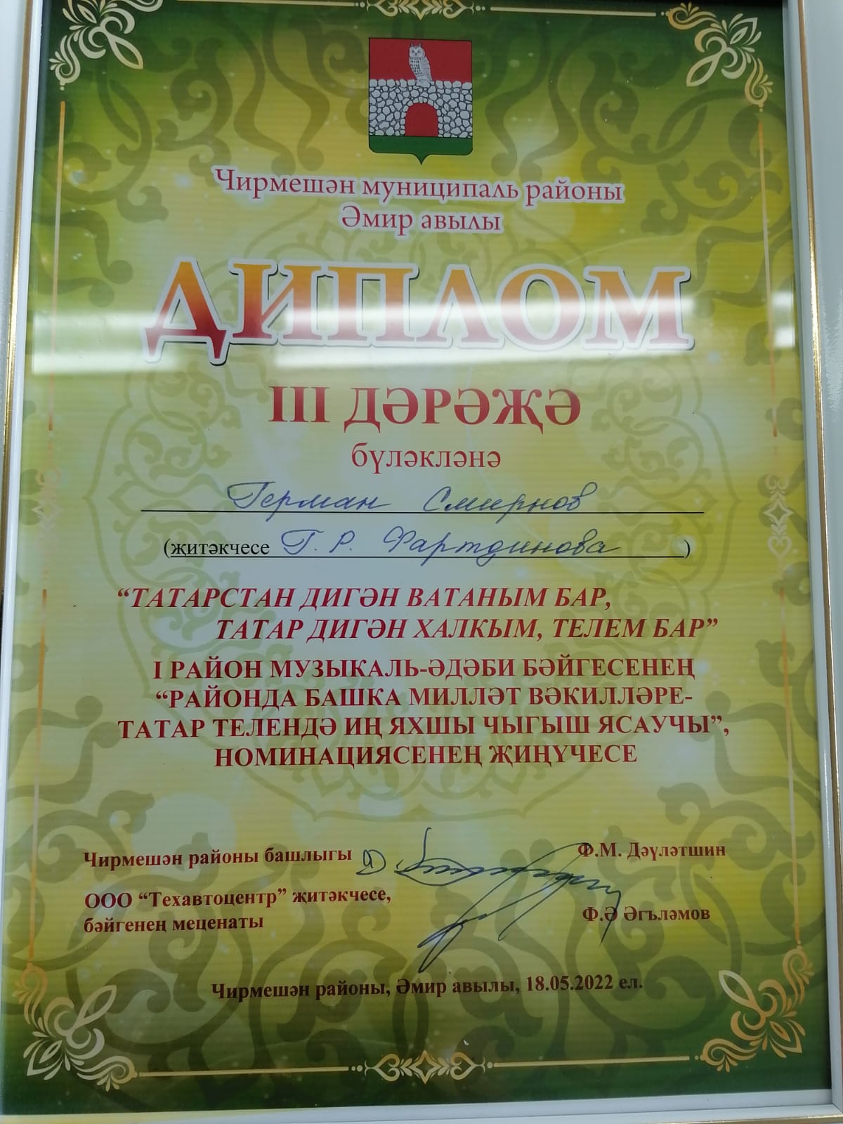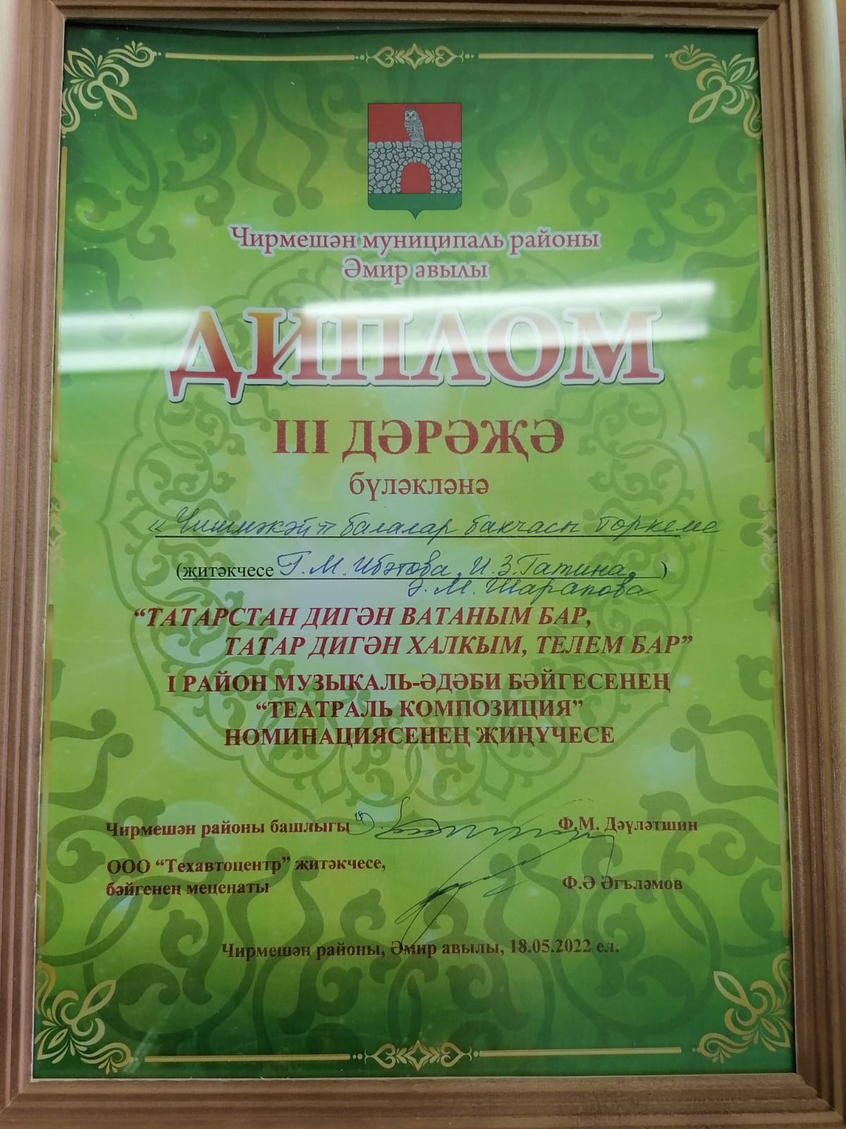 В селе Амирово Черемшанского района прошел 1 - ый районный музыкально-литературный конкурс "Татарстан дигән Ватаным бар, Татар дигән халкым, телем бар". Воспитанник МБДОУ " Черемшанский детский сад N3 "Родничок"Смирнов Герман занял 3 место в номинации "Представители других национальностей района-лучшие выступающие на татарском языке". А также 3 Место занял театральный коллектив в номинации "Театральная композиция". Все участники получили сертификаты, подарки. А победители получили дипломы и денежные призы.