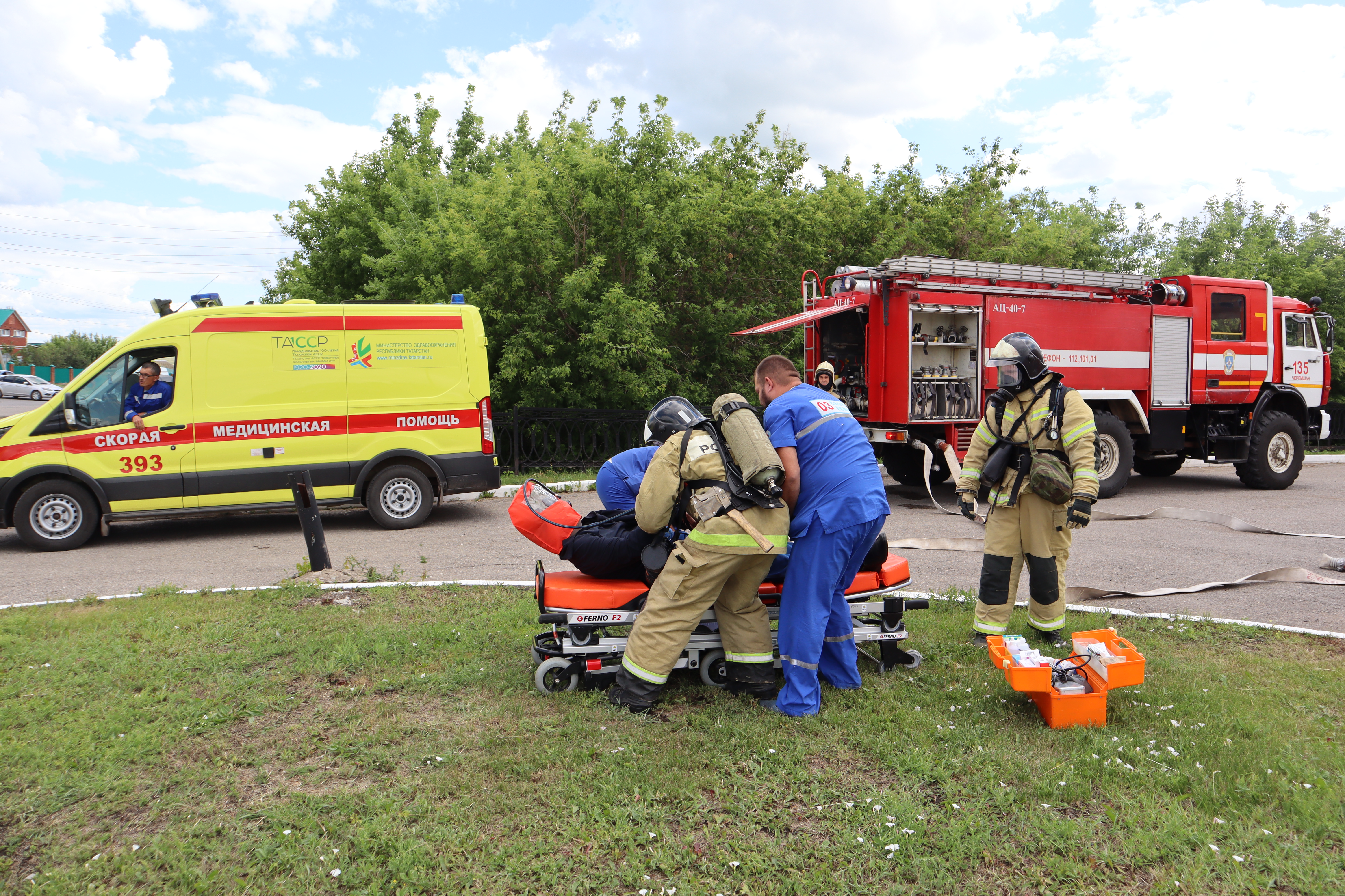 На условный пожар приехали огнеборцы трех пожарно-спасательных частей Черемшанского района, скорая помощь, полиция, администрация и другие службы экстренного реагирования. Два человека были спасены со второго этажа Ледового дворца «Юбилейный» с помощью специальных устройств для защиты органов дыхания. Полностью ликвидировать условный пожар удалось менее чем за 30 минут.
