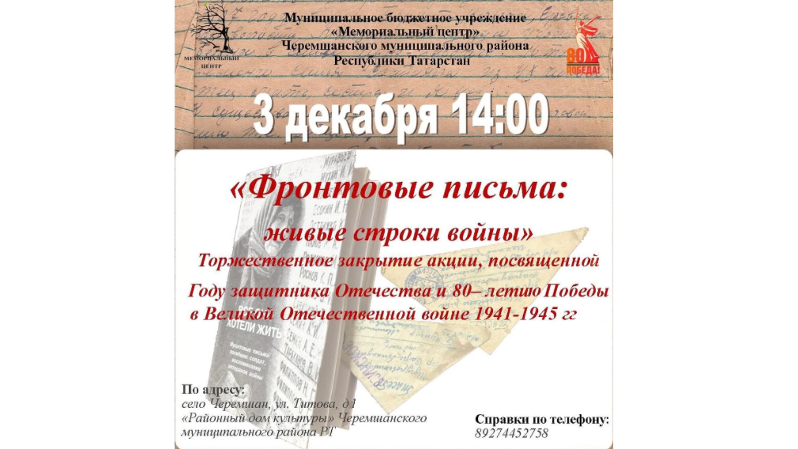 3 декабря, в День Неизвестного солдата, в Районном доме культуры состоится торжественное закрытие патриотической акции «Фронтовые письма». Приглашаем всех черемшанцев разделить этот важный момент!