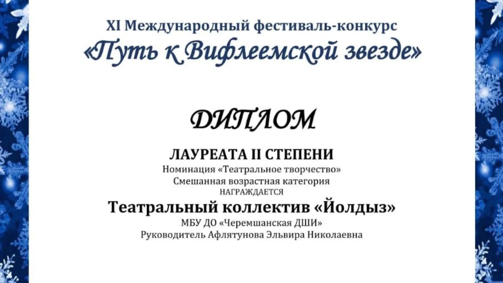 Театральный коллектив "Йолдыз" Детской школы искусств принял заочное участие в XI Международном фестиваль-конкурсе "Путь к Вифлеемской звезде" и стал Лауреатом II степени в номинации "Театральное творчество". Преподаватель Афлятунова Э. Н.
