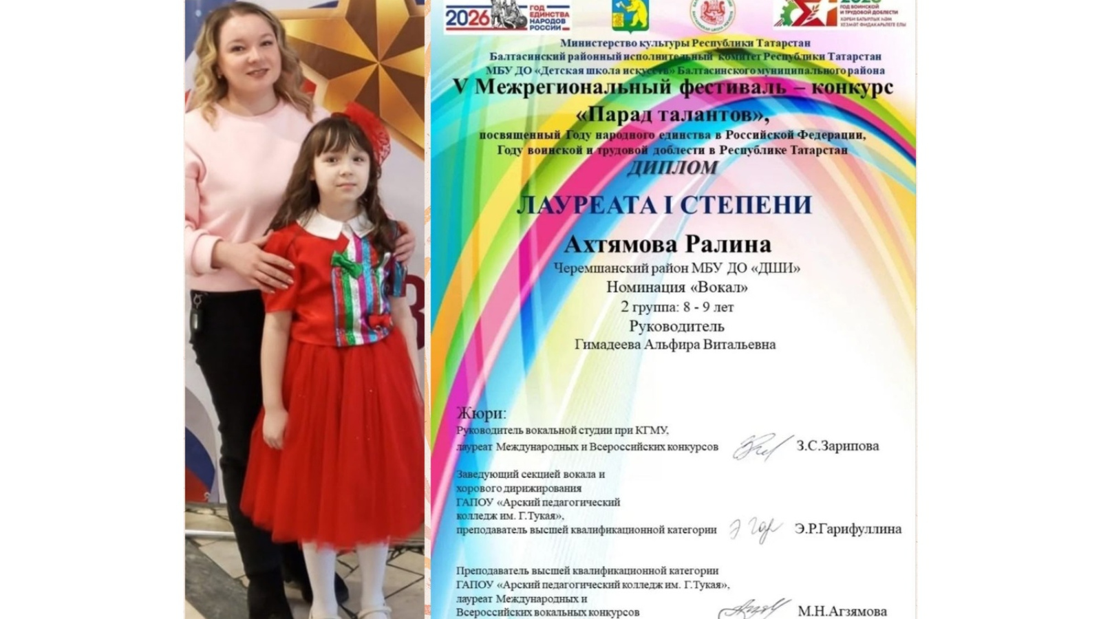 Учащаяся Детской школы искусств Ахтямова Ралина стала Лауреатом I степени на V Межрегиональном фестиваль-конкурсе «Парад талантов», посвящённый Году народного единства в Российской Федерации, Году воинской и трудовой доблести в Республике Татарстан. Преподаватель Гимадеева Альфира Витальевна.