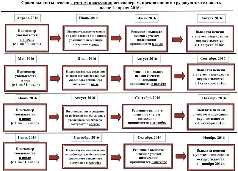 Напоминаем Вам, что выплата страховой пенсии с учетом индексации осуществляется только через три месяца после месяца увольнения*. Например, прекратившим трудовую деятельность в апреле 2016 года пенсия с учетом индексации выплачивается только с 1 августа 2016 года (май, июнь, июль), уволенным в мае 2016 года – начиная с 1 сентября 2016 года (июнь, июль, август) и т.д.