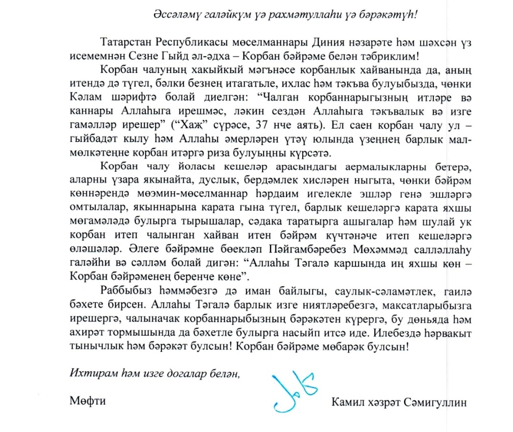 ТР мөфтие Камил хәзрәт Сәмигуллин татарстанлыларны Корбан бәйрәме белән котлады