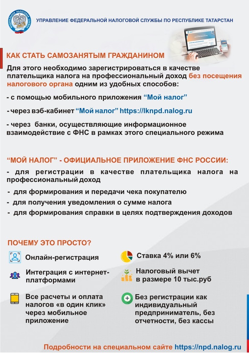 Управлением Федеральной налоговой службы России по Республике Татарстан разработаны материалы в рамках реализации пилотного проекта по применению специального налогового режима «Налог на профессиональный доход» на территории Республики Татарстан.