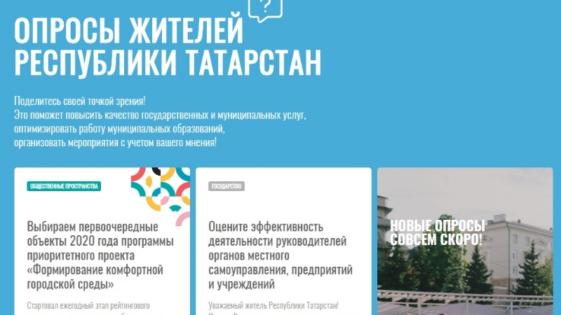 Стартовал ежегодный этап рейтингового голосования по определению общественных пространств для благоустройства в 2020 году по программе «Формирование комфортной городской среды». По итогам голосования в перечень будут внесены объекты, за которые проголосовало большинство жителей Республики Татарстан.