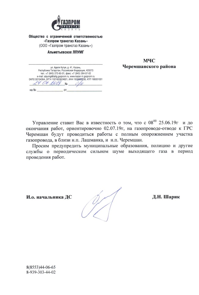 С 25 июня по 2 июля 2019 года будут проводится работы с полным опорожнением участка газопровода в близи населенных пунктов Лашманка и Черемшан. В связи с чем, будет периодический сильный шум выходящего газа в период работ.