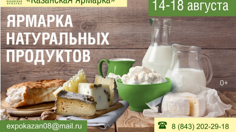 Татарстан Республикасы Авыл хуҗалыгы һәм азык-төлек министрлыгы 2019 елның 14 – 18 август көннәрендә “Казан ярминкәсе” күргәзмә үзәге территориясендә узачак азык-төлек продуктларының беренче махсуслаштырылган «Натураль продуктлар ярминкәсе» күргәзмәсендә катнашырга чакыра.