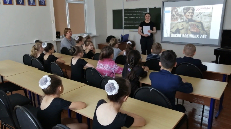 18 февраль көнне Баһаветдинова Алия Марат кызы балалар сәнгать мәктәбенең халык уен кораллары һәм хореография бүлегендә укучылар өчен, илебез тарихында бөек датага - Бөек Ватан сугышында җиңүнең 75 еллыгына багышлап "Сугыш еллары җырлары" дигән темага сыйныф сәгате үткәрде. Укучылар Бөек Ватан сугышы җырларының барлыкка килү тарихы белән таныштылар. Әлеге чаралар ватанпәрвәрлек, Ватан тарихына, аның мәдәни мирасына карата хөрмәт хисе тәрбияли.