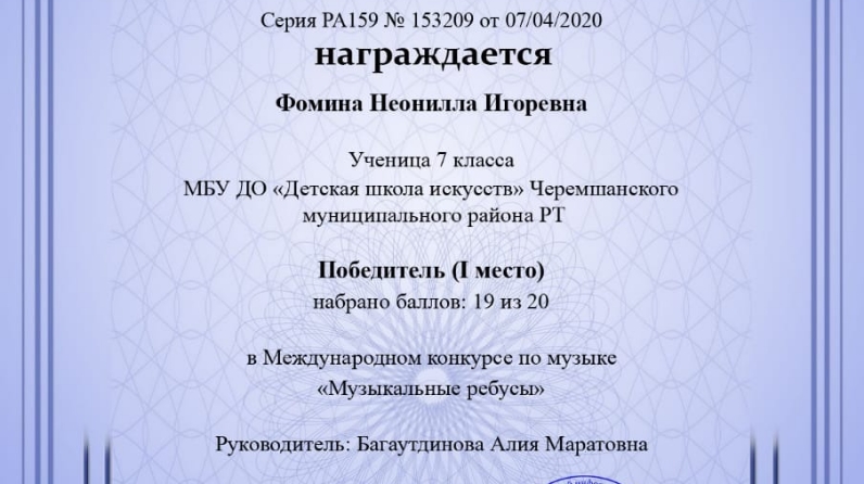Балалар сәнгать мәктәбенең 7 сыйныф укучысы Фомина Неонила музыка буенча "Музыкаль ребуслар" Халыкара конкурсында 1 урынга лаек булды. Укытучысы Баһаветдинова Алия Марат кызы.