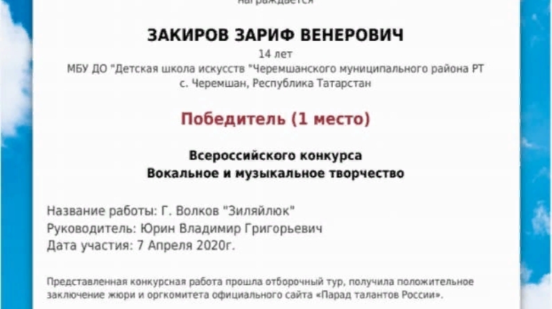 Балалар сәнгать мәктәбенең халык уен кораллары бүлеге укучысы Закиров Зариф Г. Волковның "Зиләйлүк" әсәре белән "Вокал-музыка иҗаты" Бөтенроссия конкурсында 1 урынга лаек булды. Укытучысы Юрин Владимир Григорьевич.