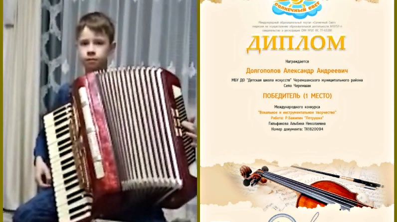 Балалар сәнгать мәктәбенең халык уен кораллары бүлеге 1 сыйныф укучысы Долгополов Александр «Вокал һәм инструменталь иҗат" Халыкара конкурсында 1 урын яулады, җитәкчесе Гыйльфанова Альбина Николаевна. Конкурста төрле төбәкләрдән йөздән артык бала катнашты. Александр Бажилинның «Петрушка» пьесасын тәкъдим итте, жюри югары бәя бирде. Җиңүчене котлыйбыз һәм иҗади уңышлар телибез.