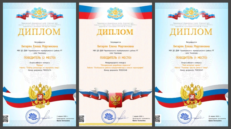 Балалар сәнгать мәктәбе концертмейстеры Хитарян Елена Мартиновна "Педагогның методик эшләнмәләре" Халыкара конкурсында "Хореография классында концертмейстер эшенең үзенчәлекләре" эше һәм "Музыка" Бөтенроссия конкурсларында "Халык биюе буенча репертуар сайлау" һәм "Минем автор проекты" эше белән җиңүче булды. Яхшы нәтиҗәләре белән котлыйбыз һәм киләчәктә дә уңышлар телибез!