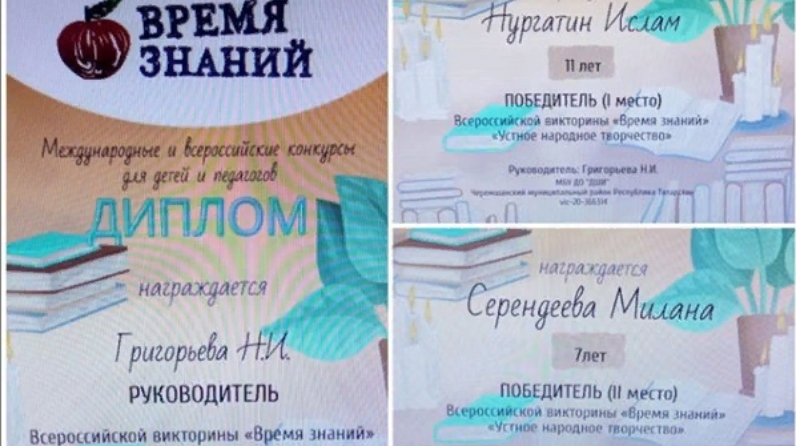 Балалар сәнгать мәктәбе копилкасында бүләкләр артты ! Фольклор бүлеге укучылары "Белем вакыты" Бөтенроссия викторинасында "Халык иҗаты" номинациясендә үзләренең уңышлары белән сөендерделәр. Балаларны һәм укытучы Григорьева Наталья Ивановнаны котлыйбыз.