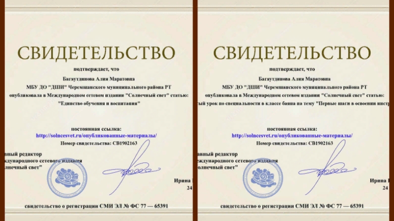 Балалар сәнгать мәктәбенең халык уен кораллары бүлеге укытучысы Баһаветдинова Алия Марат кызы "Кояшлы дөнья" Халыкара челтәрле басмасында баян классында белгечлек буенча мәкаләләрен бастырып чыгарды.