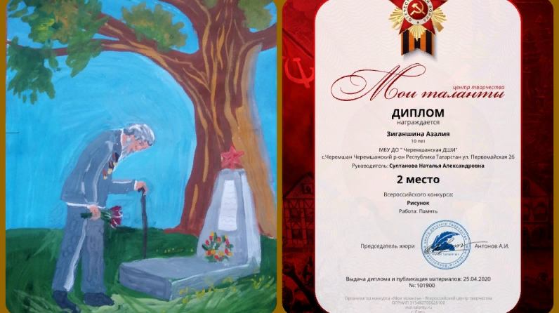 Балалар сәнгать мәктәбенең рәсем сәнгате бүлеге укучылары Холматова Марьяна һәм Җиһаншина Азалия "Рәсем" Бөтенроссия конкурсында җиңү яулады. Марьяна конкурска "Фронттан хат", Азалия "Хәтер" дигән эш тәкъдим итте. Җитәкчеләре Султанова Наталья Александровна. Җиңүчеләрне котлыйбыз һәм киләчәктә дә иҗади уңышлар телибез!