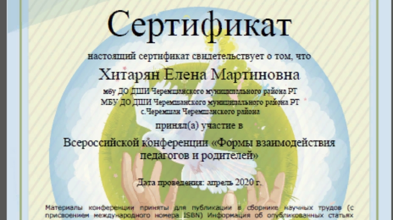 Балалар сәнгать мәктәбе концертмейстеры Хитарян Елена Мартынова «Педагог дөньясы» сайтында «Педагоглар һәм ата-аналарның үзара хезмәттәшлеге формалары» дигән Бөтенроссия конференциясендә катнашты. Онлайн-тәҗрибә уртаклашу үсеп килүче буынга эстетик тәрбия бирүгә юнәлтелгән, ата-аналар белән тагын да нәтиҗәлерәк һәм сыйфатлырак эш алып барырга мөмкинлек бирә.