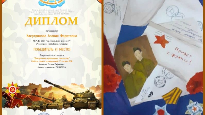 Балалар сәнгать мәктәбенең сәнгать бүлеге укучысы Хәертдинова Азалия «Декоратив-гамәли иҗат» Бөтенроссия конкурсында җиңүче булды. Жюри бәясенә Азалия Бөек Ватан сугышында җиңүнең 75 еллыгына багышланган плакат тәкъдим итте. Укытучысы Әхтәмов Руслан Рафик улы.