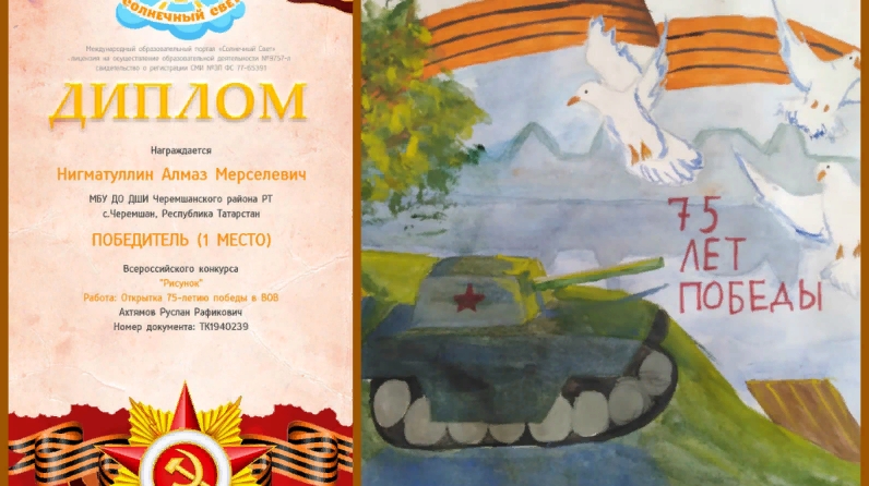 Балалар сәнгать мәктәбенең рәсем сәнгате бүлеге укучысы Әхтәмов Руслан Рафикович тагын бер укучысы җиңүгә иреште. Нигъмәтуллин Алмаз «Рәсем» Бөтенроссия конкурсында «Бөек Ватан сугышында җиңүнең 75 еллыгына открытка» эше белән 1 урынга лаек булды. Җиңүчене котлыйбыз һәм киләчәктә дә иҗади үсеш телибез!