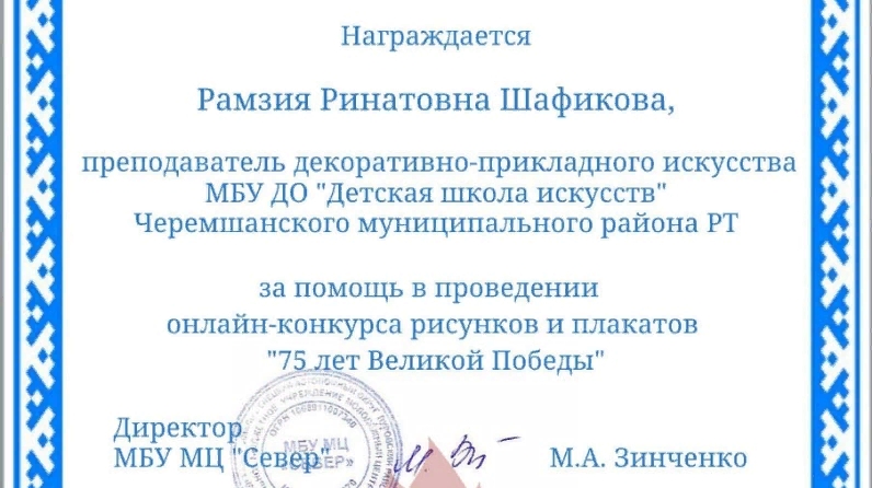 Балалар сәнгать мәктәбенең сәнгать бүлеге укытучысы Шәфыйкова Рәмзия Ринат кызы "Север" яшьләр үзәге муниципаль бюджет учреждениясенең "Бөек Җиңүгә - 75 ел" дигән рәсем һәм плакатлар онлайн-конкурсын уздыруда күрсәткән ярдәме өчен Рәхмәт хаты белән бүләкләнде.