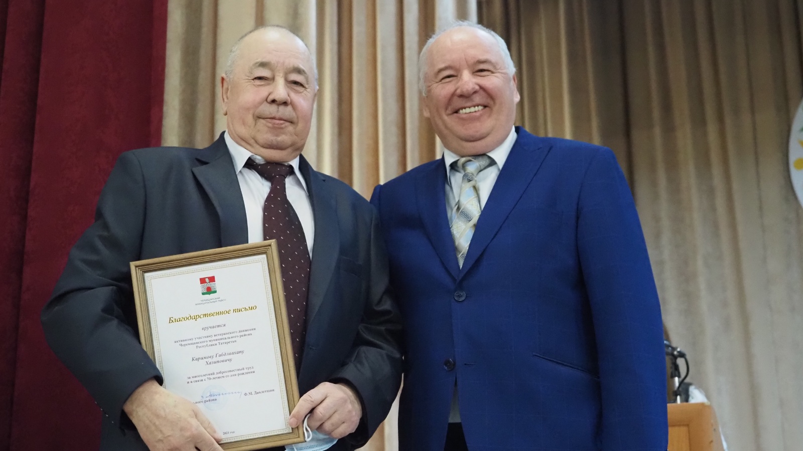 Күпьеллык намуслы хезмәте һәм 70 яшьлек юбилее уңаеннан, районның ветераннар хәрәкәте активисты Габделваһап Хаҗип улы Кәримов; районда физик культураны һәм спортны үстерүгә керткән лаеклы өлеше өчен, районның “Чирмешән” спорт мәктәбе тренеры Рамил Илдар улы Баһаветдинов; күпьеллык хезмәте һәм районда мәдәният үсешенә керткән өлеше өчен, балалар сәнгать мәктәбе укытучысы Фәйзелхак Габделхак улы Вилданов район башлыгының Рәхмәт хаты белән кызыксындырылды.