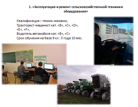 - «Эксплуатация и ремонт сельскохозяйственной техники и оборудования» с получением квалификации «Техник-механик» и рабочих профессий тракторист-машинист категории В,С,Д,Е,F, водитель категории «С». Срок обучения 3 года 10 месяцев.