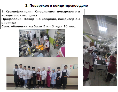 - «Поварское и кондитерское дело» с получением квалификации специалист по поварскому и кондитерскому делу и рабочей профессии Повар, кондитер. Срок обучения 3 г.10 м.