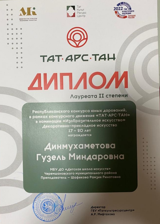 Балалар сәнгать мәктәбенең декоратив-гамәли сәнгать бүлекчәсе укучылары 20 ноябрьдә зур концерт залының төп сәхнәсендә узган «ТАТ- АРС-ТАН» конкурсы кысаларында яшь талантлар республика конкурсында җиңүчеләрнең гала-концертында катнаштылар. Шафикова Рәмзия Ринат кызы укучылары: Динмөхәммәтова Гүзәл 2 урынны алды, Камалова Камил, Нуртдинова Алия һәм Галимова Адилә финалга үттеләр.