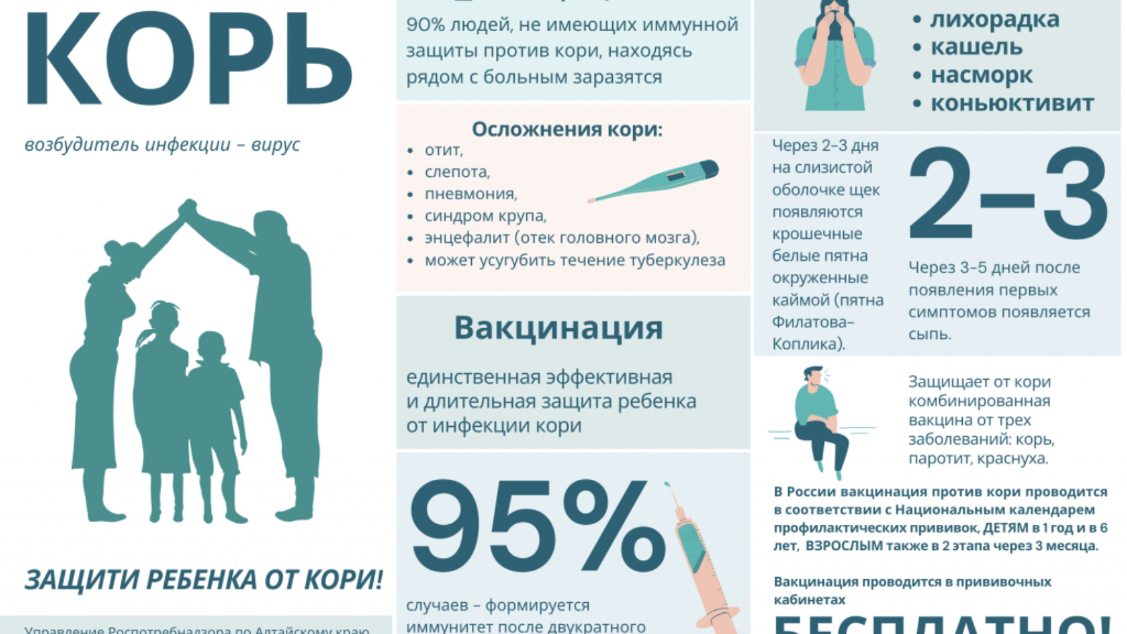 Следует помнить, распространение кори возможно среди не привитых против кори жителей, при тесных контактах заражение не привитого человека неизбежно!