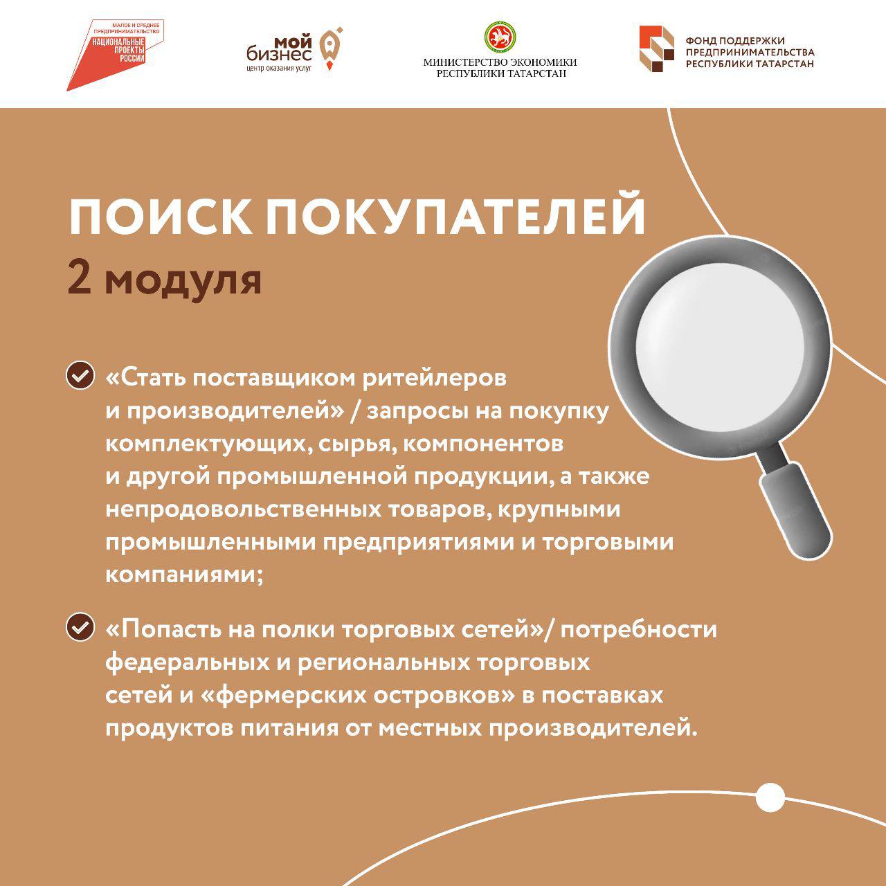 В модуле «Стать поставщиком ритейлеров и производителей» размещаются запросы на покупку комплектующих, сырья, компонентов и другой промышленной продукции, а также непродовольственных товаров крупными промышленными предприятиями и торговыми компаниями. Модуль содержит актуальную информацию о более чем 5 500 запросах торговых сетей и крупных производственных компаний из России и из-за рубежа на покупку комплектующих, сырья, компонентов и другой промышленной продукции, а также непродовольственных товаров. Данная информация доступна всем авторизованным пользователям Цифровой платформы МСП.
