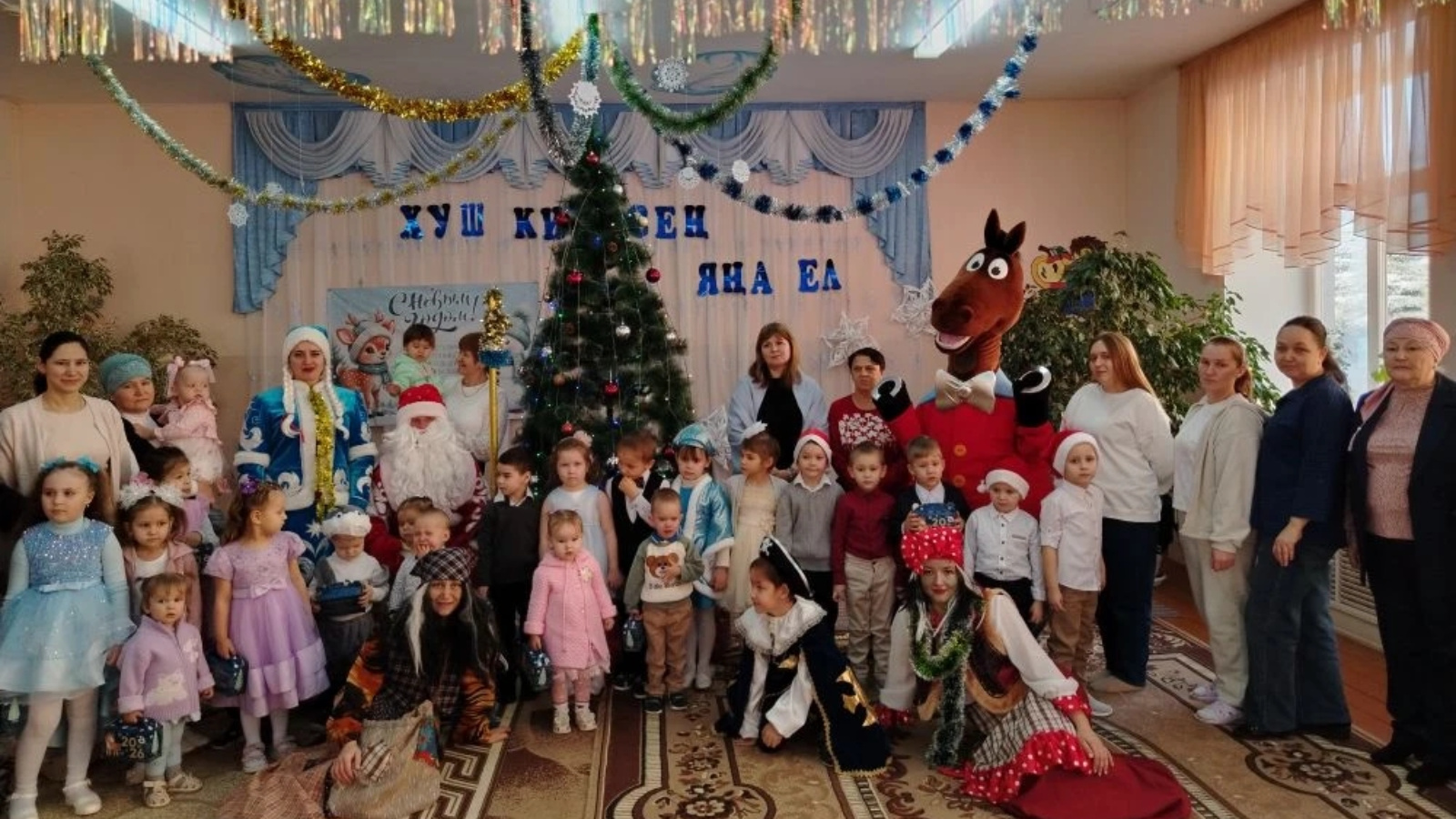 Яңа ел тамашасы, уеннар һәм биюләр, әкият персонажлары һәм, әлбәттә, яңа елның төп кунаклары, Кыш Бабай белән Кар Кызы һәм киләсе елның символы - ат белән балаларга онытылмаслык тәэсирләр һәм яңа ел кәефе бүләк итте. Алар бәйрәм атмосферасына чумдылар.
