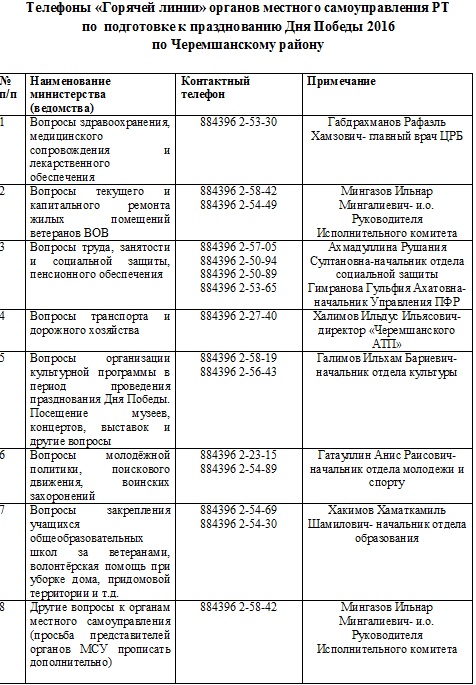 Чирмешән районы буенча Җиңү бәйрәменә әзерлек буенча җирле үзидарә органнарының "Кайнар элемтә" телефоннары