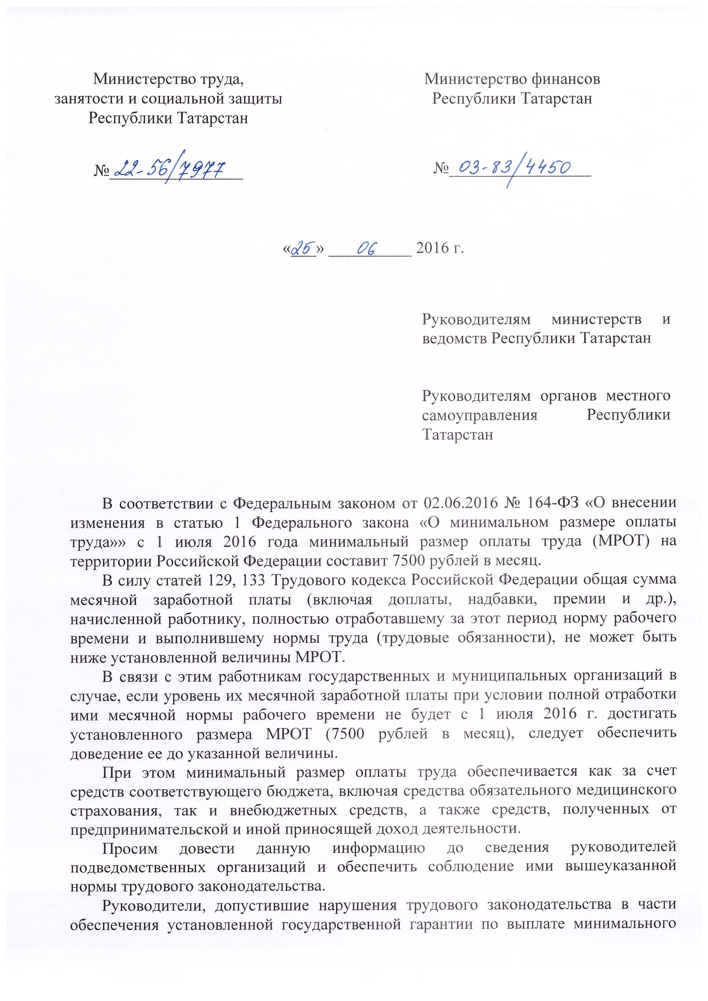 В связи с принятием Федерального закона от 02.06.2016 № 164-ФЗ «О внесении изменения в статью 1 Федерального закона «О минимальном размере оплаты труда»», устанавливающего с 1 июля 2016 года минимальный размер оплаты труда (МРОТ) на территории Российской Федерации 7500 рублей в месяц.