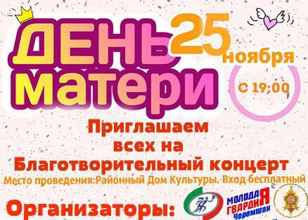 Бүген, 2016 елның 25 ноябрендә Яшь гвардиячеләр Әниләр көненә багышлап концет оештыра. Концерт район мәдәният йортында 19 сәгатьтә башлана. Рәхим итегез!